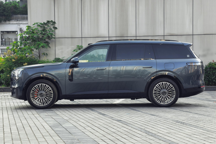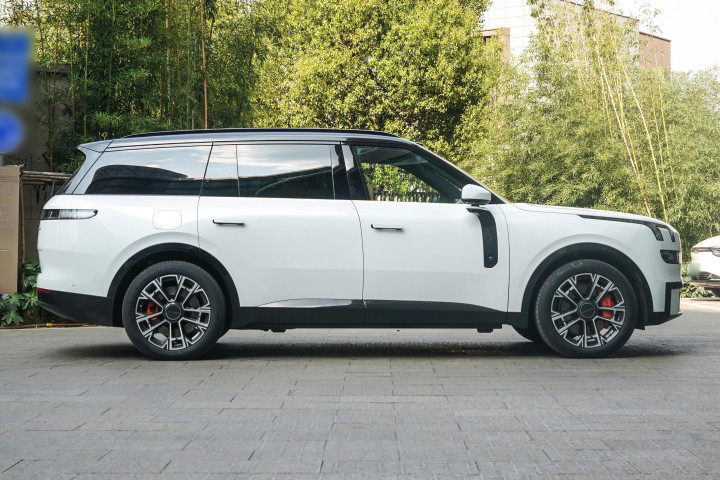 车身侧面线条流畅修长,曲面车门设计和隐藏式门把手显得异常简洁,黑化侧柱营造出悬浮顶的效果,配合庞大体型,有着类似路虎揽胜的精致与大气,21英寸双五幅式轮毂与红色刹车卡钳提升运动感。车尾设计则简洁有力,贯穿式尾灯组在点亮后拥有出色的视觉效果,尾门采用天地门设计,不仅是好看,也更加实用,整体外观在经典与创新之间取得了平衡,符合高端家庭用户对车辆气场与格调的期待。