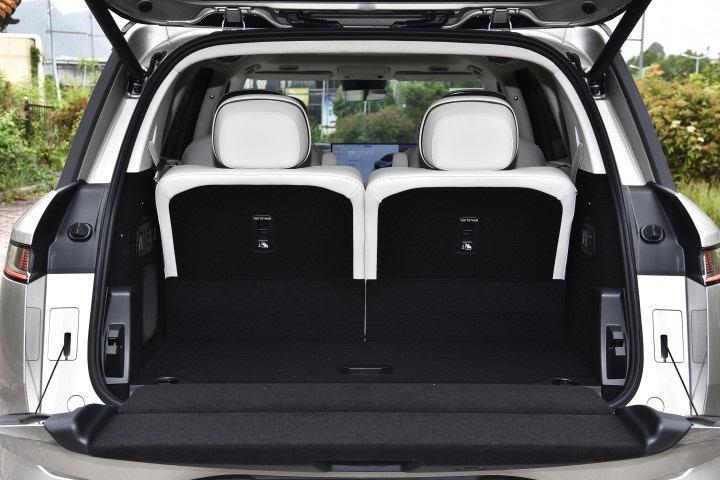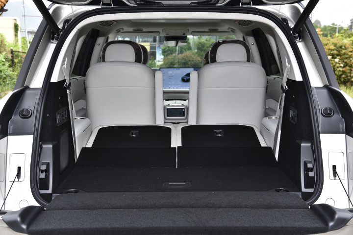 满载6人情况下,后备厢常规容积300升,放5个20寸行李没问题,满足日常购物或短途旅行的行李装载需求。第三排座椅放倒之后,容积能拓展到1070升,后备厢变成一个巨大且平坦的装载空间,搬运大件物品很方便,天地门比较实用,地门能承重300公斤,露营时能当操作台。