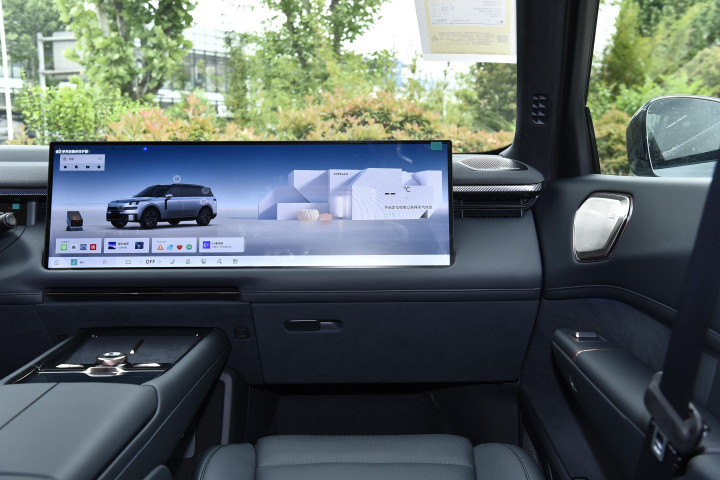 配备12.66英寸窄条液晶仪表、95英寸AR-HUD抬头显示以及30英寸中控副驾一体式大联屏,分辨率达到了6K,显示效果细腻,另外还配有30英寸6K吸顶娱乐屏,几块屏幕之间支持多屏交互,通过便捷的手势控制,如三指飞屏,内容可以在前后排屏幕间自由流转,方便共享影音娱乐。